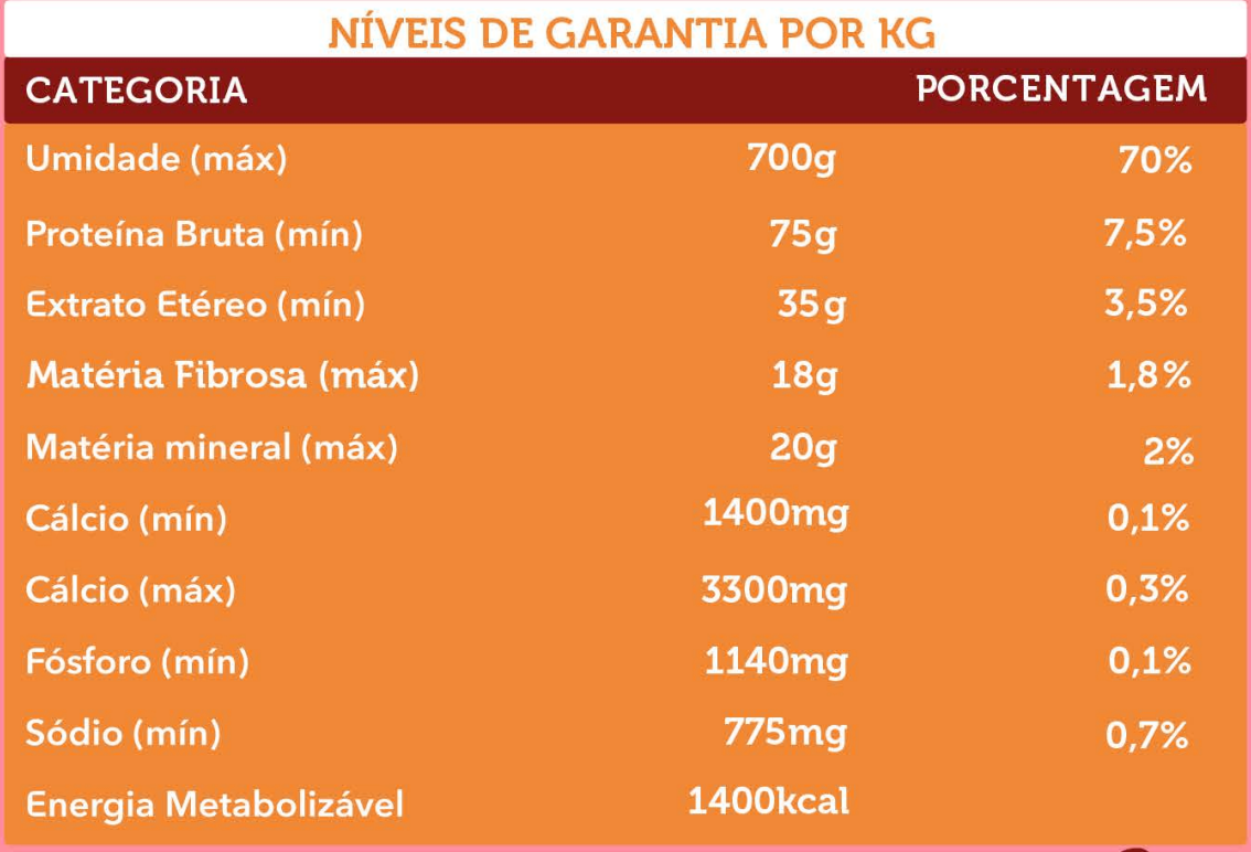 Ingredientes: Batata, carne de bovino, fígado de boi, abóbora, abobrinha, couve, farelo de aveia, óleo de soja, óleo de girassol, cloreto de sódio (sal comum), carbonato de cálcio, potássio, cobalto, cobre, ferro, manganês, selênio, extrato de alecrim, extrato de Yucca, fruto-oligossacarídeos, galacto-oligossacarídeos, magnésio, iodo, zinco.